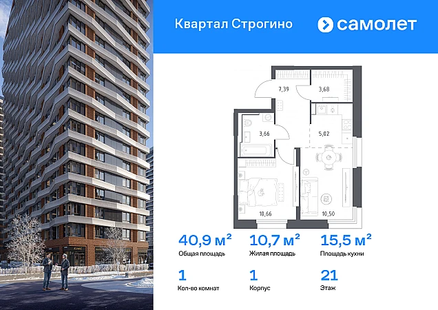 Строим кварталы для жизни с заботой о будущем. Предлагается 1-комнатная квартира комфорт-класса 40,91 кв.м в корпусе 1 на 21 этаже, в ЖК «Квартал Строгино»