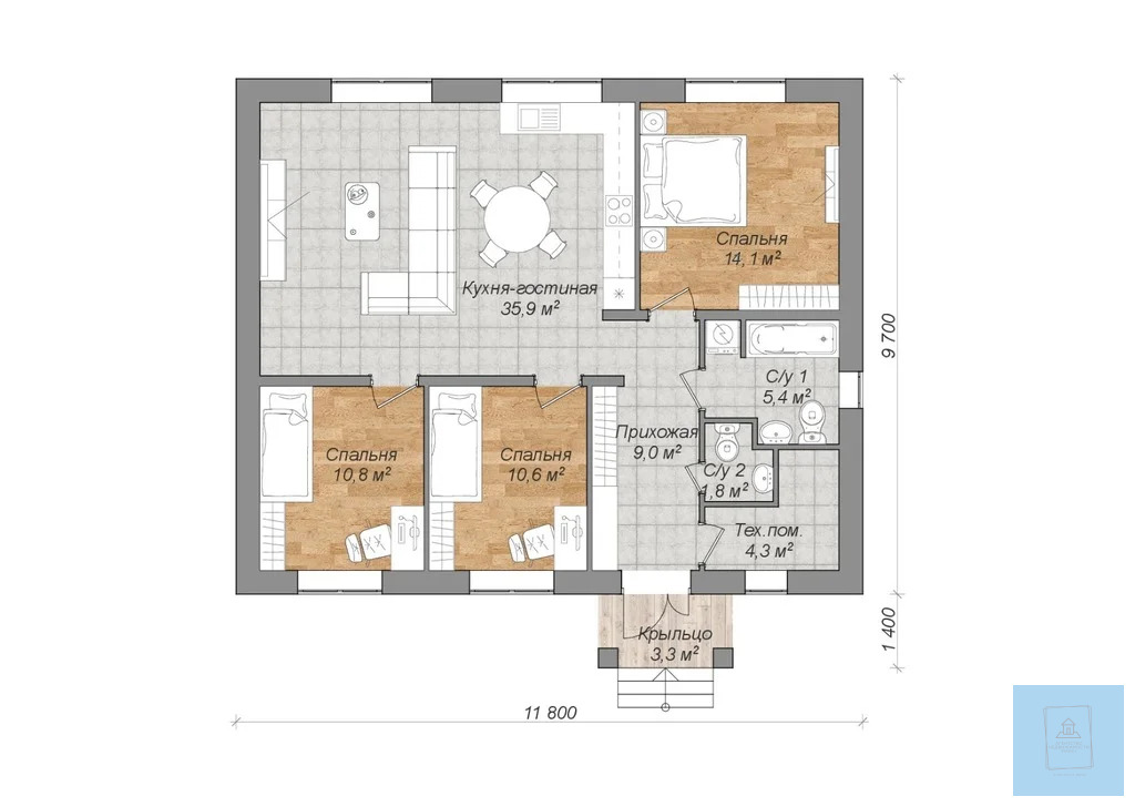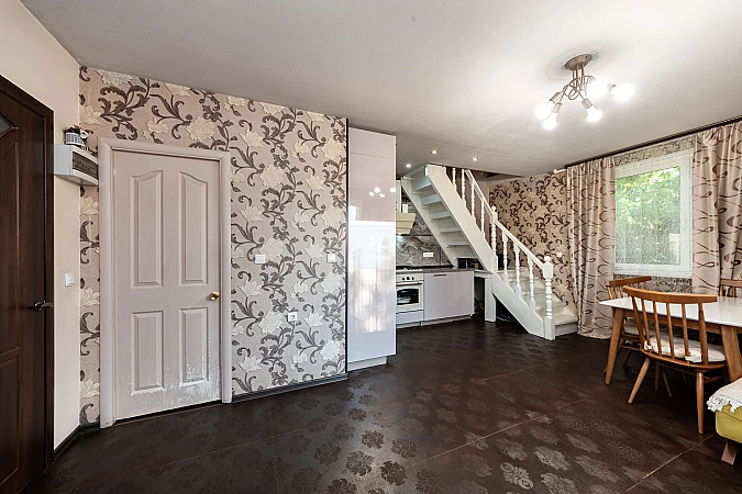 На первом этаже кухня-гостиная, на втором этаже расположены две спальных комнаты.