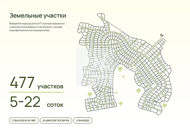 477 земельных участков от 5 до 22 соток, правильной геометрической формы у въезда,в центре поселка или с выходом в лес.