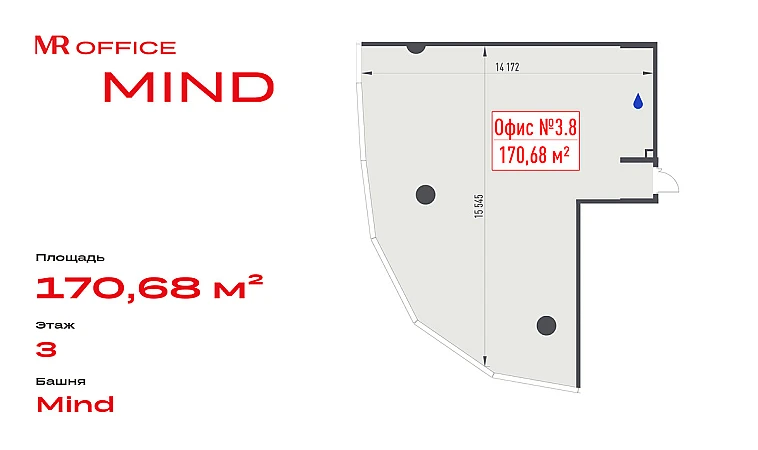 MIND — это 17-этажная офисное здание с современной архитектурой, панорамным остеклением и технологичной инженерией. Помещения предполагают возможность индивидуального зонирования пространства под задачи вашей команды.