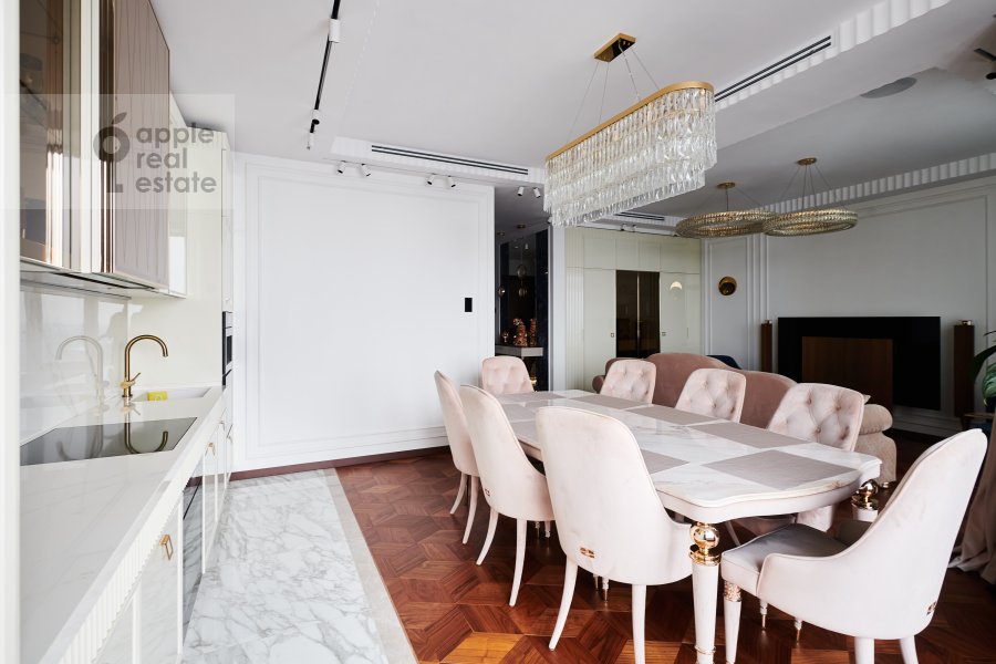 Помимо стандартного набора для такого сегмента (техника Miele, сантехника Villeroy&Boch, итальянская дорогая мебель, натуральные дерево и камень), в квартире установлена система "Умный дом" от TIS: можно управлять с телефона всем – от освещения и кондиционирования до камер наблюдения.