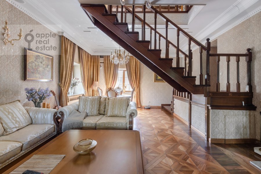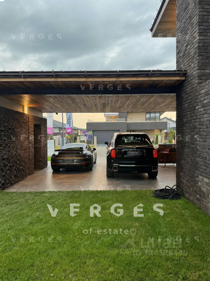 На большом тихом участке высажены взрослые деревья, застелен газон. Над гаражом выстроена 4-комнатная квартира с лифтом. Крытая беседка-барбекю, домик охраны, парковка на несколько автомобилей и искусственный пруд.