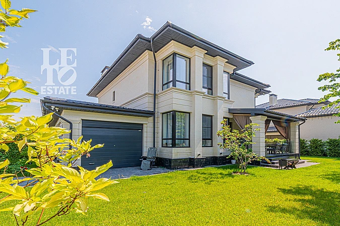 На участке 6 соток сделан ландшафтный дизайн, высажены декоративные кустарники и растения, выстелен газон. Установлена дренажная система, автополив, освещение. Участок полностью огорожен, ворота с электроприводом. Отличное расположение относительно других домов, всего с двух сторон соседи.