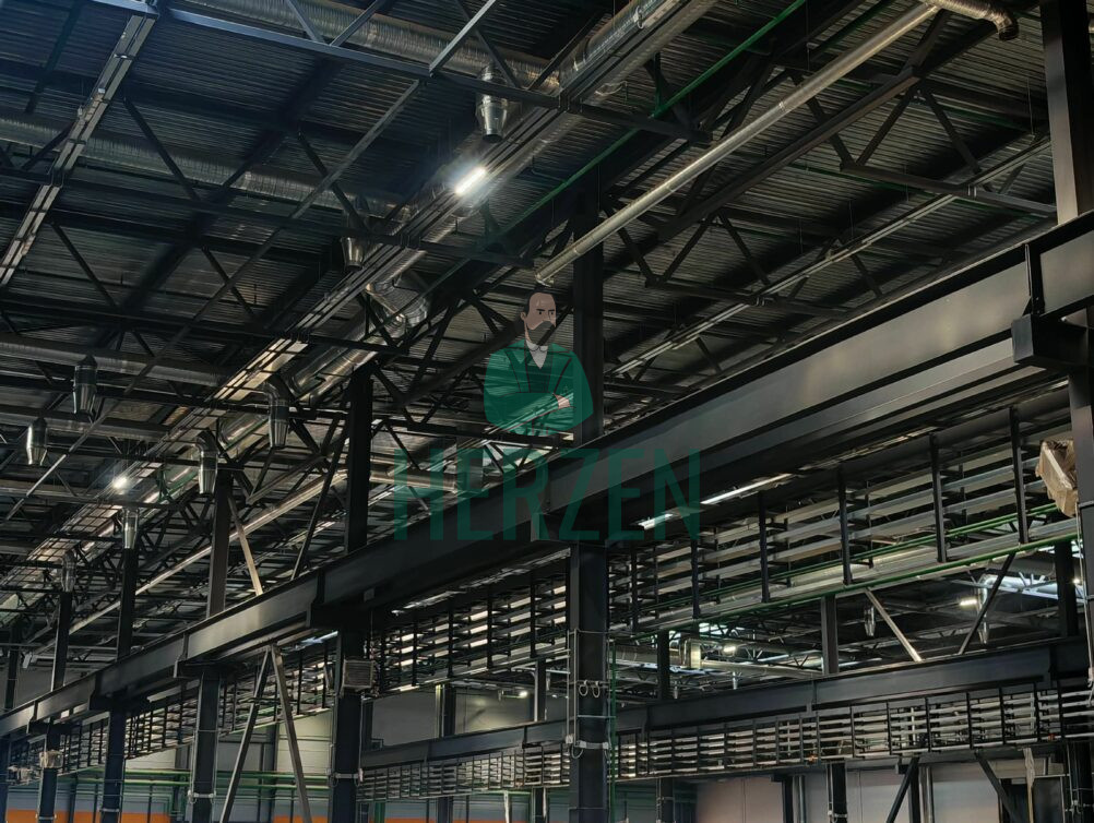 Стальной профилированный настил по двускатным металлическим фермам с уклоном 3%, с внутренним водостоком со сроком службы более 20 лет.