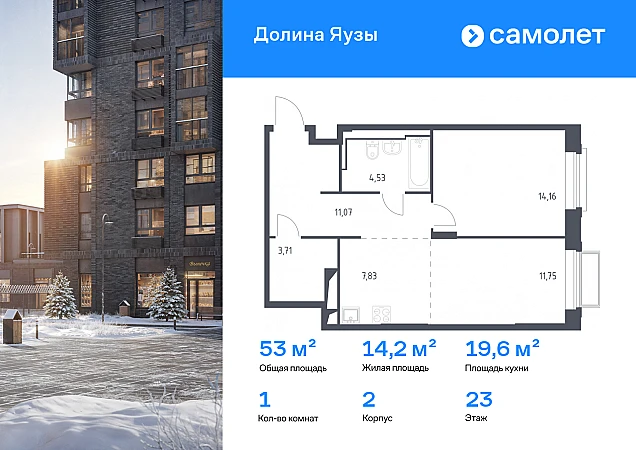 Строим кварталы для жизни с заботой о будущем. Предлагается 1-комнатная квартира комфорт-класса 53 кв.м в корпусе 2 на 23 этаже, в ЖК «Долина Яузы»