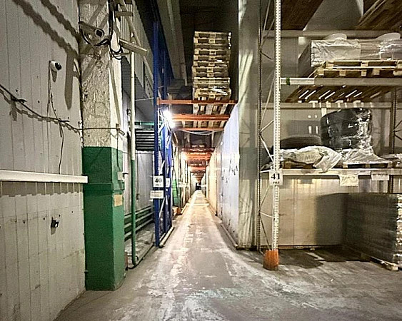 Складской комплекс класса Б, 1 этаж, высота потолков 12м, установлена стеллажная система хранения, 2 холодильные камеры. Дебаркадер с 4 воротами, есть также ворота на нулевом уровне. Большая площадка для парковки фур.