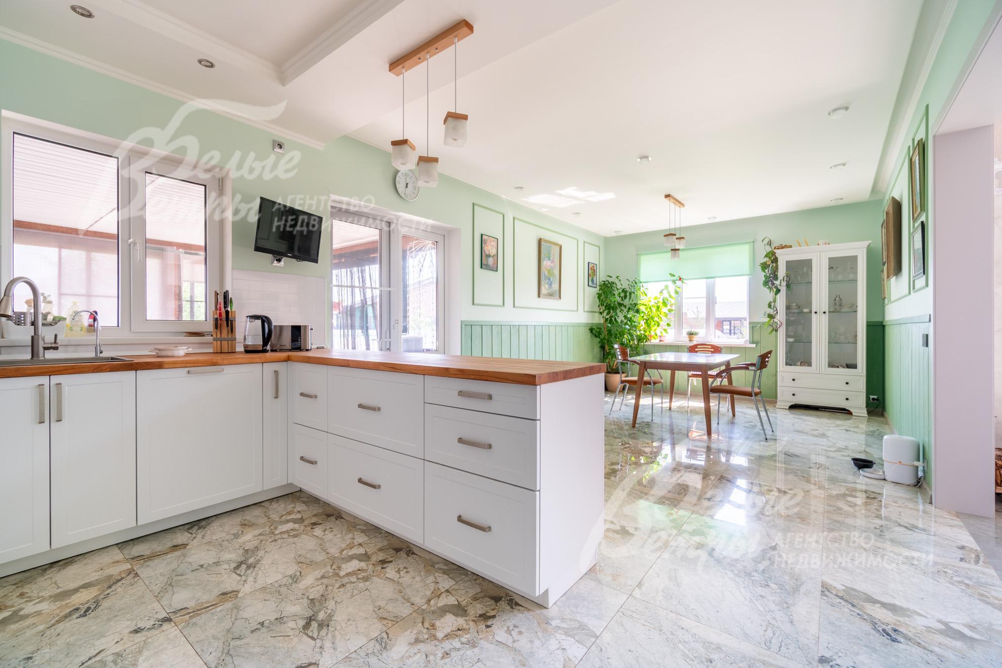 Внутренняя отделка: интерьер выполнен с использованием современных материалов в светлой пастельной гамме. Стены – покрашены, в санузлах - мозаика из натурального мрамора. Пол в гостиной и кухне отделан керамогранитом, в спальнях – ламинатом, в санузлах – плиткой. Теплый водяной пол во всем доме. Двери из массива сосны, подоконники из плитки и ПВХ. На второй этаж ведёт лестница на металлическом каркасе, с боковой подсветкой и ступенями, отделанными дубом. В доме – тщательно продуманная удобная схема расположения розеток и выключателей: точек много, в нужных местах, есть розетки usb для зарядки гаджетов.