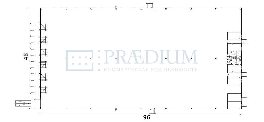 - Высота потолков: 12,5 метров — достаточно пространства для любой техники и хранения товаров.