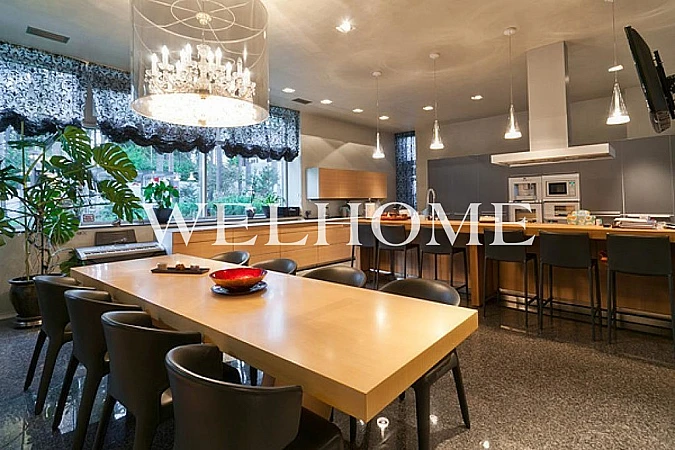 ID объекта: Z-526. Предлагается дом в современном стиле с панорамным остеклением, весь фасад дома в сером граните. На участке отдельно стоящий гараж на 2 м/м с квартирой для персонала. Котельная в гараже Viessman. На территории фонтан и беседка. Участок с ландшафтным дизайном и лесными вековыми деревьями (соснами).Рядом вся инфраструктура: магазины, рестораны, SPA-центр, образовательные учреждения и мн. др.Поэтажное описание: 1 уровень (полуцоколь): 2 гардеробные, с/у, гостевой с/у, щитовая, кухня-столовая-каминный зал (гостиная), кинозал, сауна + с/у + бассейн + душевая;2 уровень: гардеробная, с/у, комната для обуви, гостевая спальня с с/у и гардеробной, детская спальня с с/у, гардеробной и гостиной, кабинет, хозяйская спальня с гардеробной, с/у и спортзалом, детская комната;3 уровень: холл с выходом на эксплуатируемую крышу 180 м, техническое помещение (вентиляционная).Дополнительные постройки: Отдельно стоящий гараж на 2 м/м с квартирой для прислуги. На улице будет фонтан и беседка, баня.
