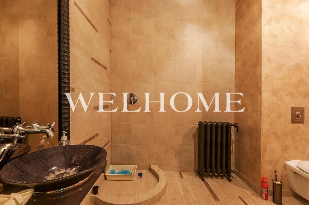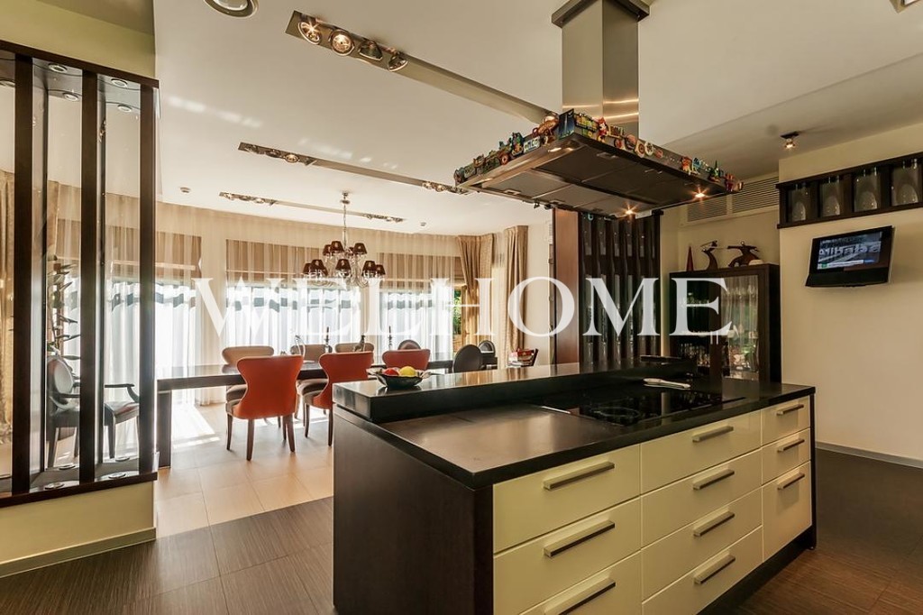 ID объекта: Z-3257. На продажу предлагается стильный особняк в охраняемом поселке. Внутренняя отделка выполнена по авторскому проекту в стиле ар деко, дом меблирован предметами от ведущих мировых производителей, оборудован бытовой техникой и сантехникой премиум-класса. В доме предусмотрена гостиная с панорамным остеклением и вторым светом, винный погреб, бильярдная, 4 спальни.Поэтажное описание: 1 этаж: гостиная с выходом на террасу, столовая-кухня, кинотеатр, холл, прихожая, 2 гостевых спальни, с/у, техническое помещение, постирочная, кладовые, бильярд, винный погреб;2 этаж: мастер спальня с с/у, кабинет, гардеробная, детская спальня, с/у, хозяйственное помещение, кухня.1 этаж: холл, гардеробная, гостевой с/у, кинотеатр (телевизионная), гостиная с выходом на террасу, столовая-кухня, 2 гостевых спальни, с/у, постирочная, техническое помещение, кладовые;2 этаж: холл, кабинет, игровая, мастер спальня с с/у и гардеробной, 2 детские спальни, детский с\у.На участке с ландшафтным дизайном высажен газон и деревья, возведен гостевой дом площадью 320 кв. м с квартирой для персонала, оборудованы игровые площадки, беседка, зона барбекю.