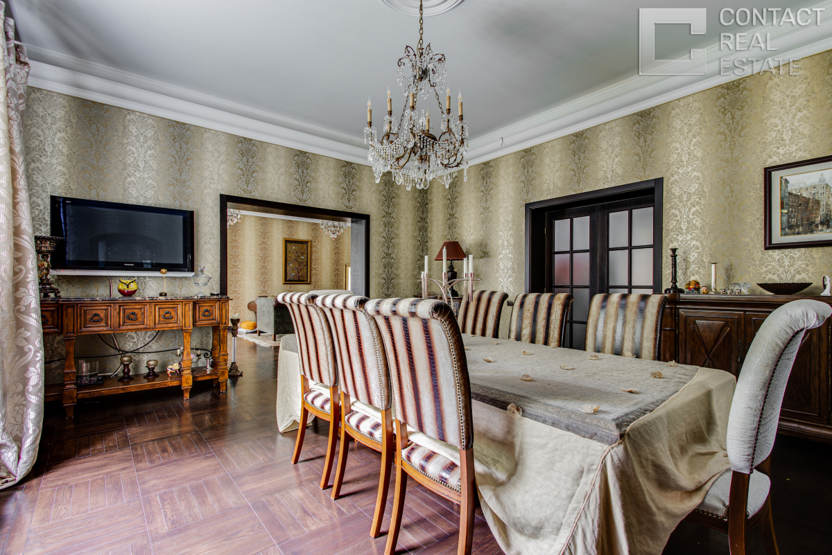 Камерный тихий поселок "Изумрудный век" расположен в лесной части в Горках-2. Здесь предлагается коттедж площадью 500 кв. м с отделкой в стиле современной классики. Проектом предусмотрено: 2 этажа, 3 спальни, комната для няни, гостиная с камином, просторный кабинет с камином, кухня-столовая, СПА-зона с сауной. Отделка выполнена качественными дорогими материалами ведущих европейских производителей. На лесном участке 15 соток помимо основного дома расположен гараж на 2 машиноместа с квартирой для персонала на 2 этаже. Центральные коммуникации, недорогое обслуживание в поселке, строго охраняемый КПП. [Лот #17517]