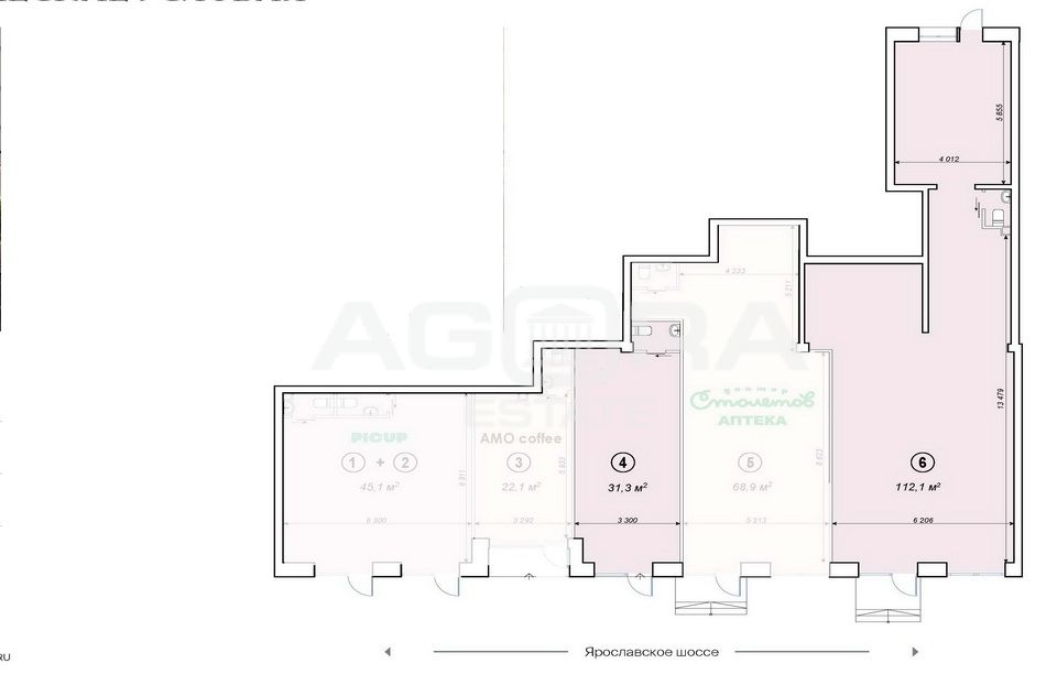 Площадь 112,1 м2 (на плане - блок 6). 1 этаж, отдельный вход с улицы, открытая планировка, высота потолка 3,2 м, витрина, все городские коммуникации.