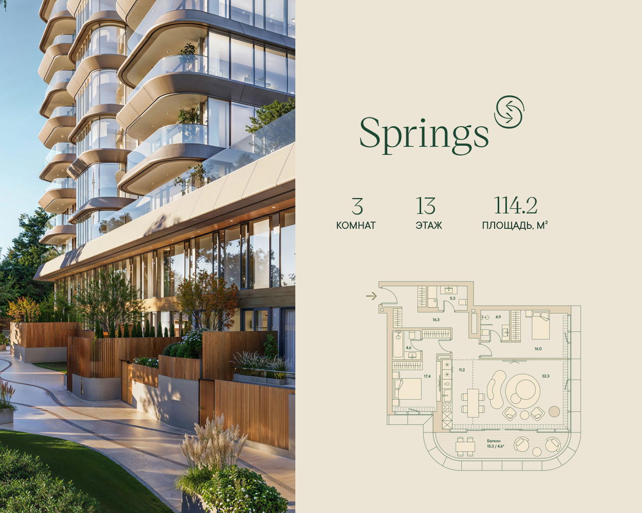 Трёхкомнатная велнес-резиденция площадью 114.2 кв. м. на 13 этаже с видом на двор и центр в доме премиум-класса Springs.