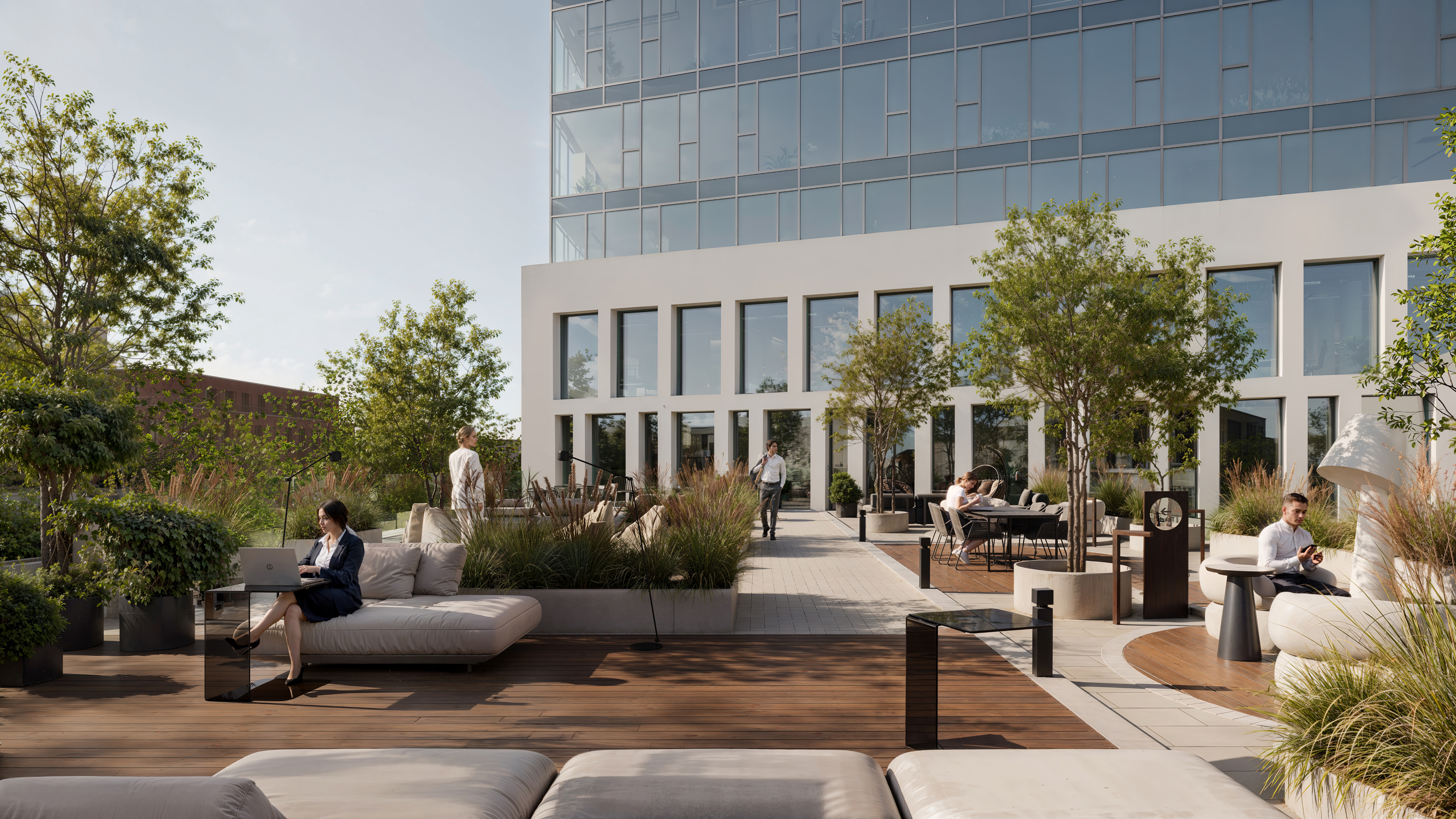 - Пешеходные маршруты, повторяющие геометрию террас бизнес-центра;