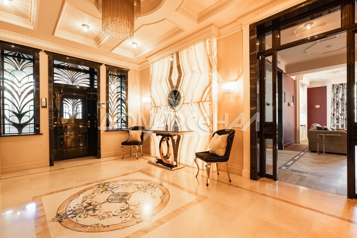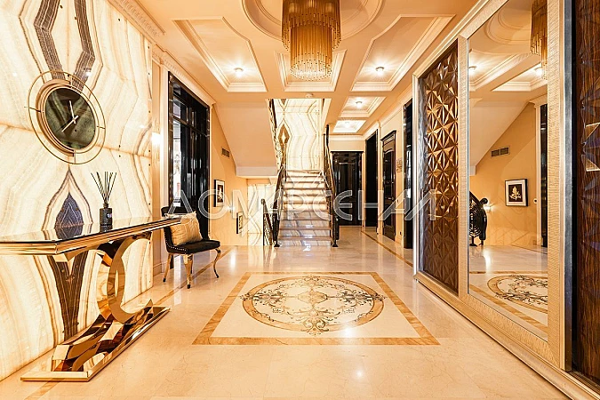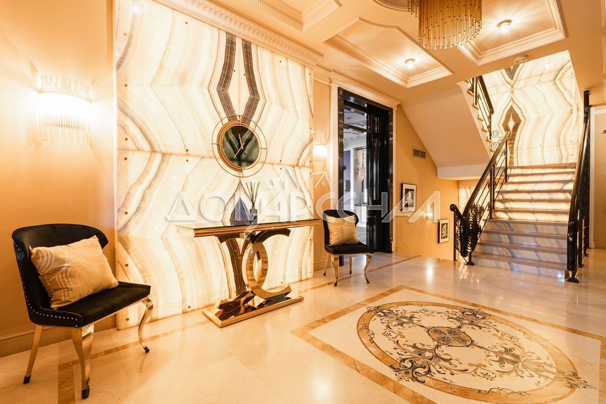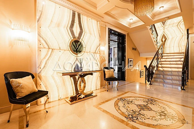 • Лестница обрамлена кованым ограждением с рисунком «цветущий сад» по канонам стиля ар-деко и потрясающим панно из натурального оникса с подсветкой
