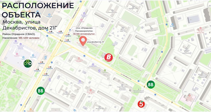 Расположение: На выходе из метро Отрадное, в локации с высоким пешеходным трафиком в густонаселенном жилом массиве.