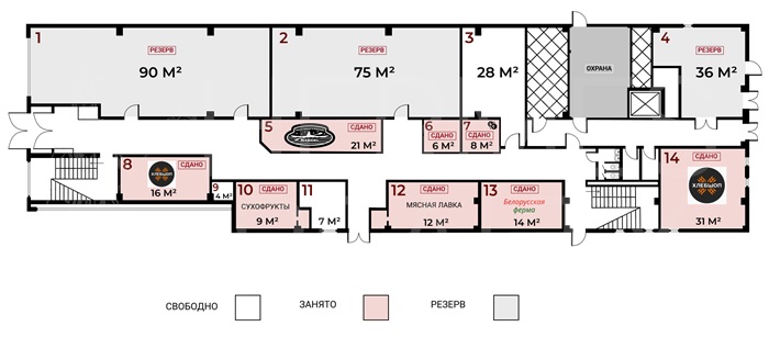 Арендаторы: На 1-м этаже расположены: Магазин здорового питания ВкусВилл; Камчатские морепродукты; Фермерские фрукты-овощи; Белорусская мясная и молочная продукция; собственная пекарня. 2-й этаж идеально подходит для фуд-корта и ресторанов. Возможно организовать летнюю веранду.Паркинг: наземный, на прилегающей территории.