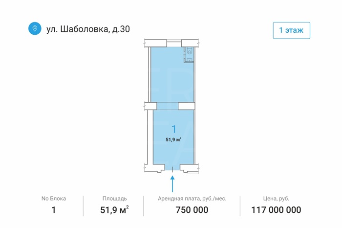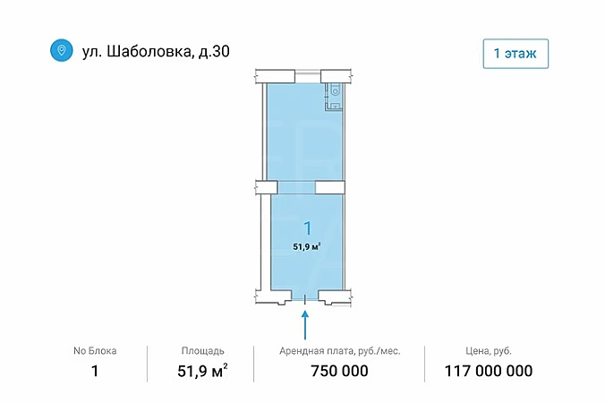 Аренда торговой площади 51,9 м2, м. Шаболовская в ЮАООписание: Аренда торговой площади 51,9 м2 м. Шаболовская на 1-м этаже жилого дома. 1-я линия домов. Отдельная входная группа с фасада. Помещение с внутренней отделкой. Планировка - открытая (свободная), высота потолков до 3,8 мРасположение: 1 минута от станции метро ШаболовскаяКоммуникации: все центральныеусловия: коммунальные платежи оплачиваются отдельно Объект №3100-948441.