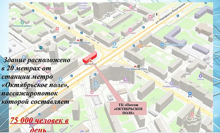 Продажа торгового центра Пассаж 1574 м2 м. Октябрьское Поле в САООписание: Продажа торгового центра площадью "Пассаж "Октябрьское Поле" площадью 1 574 м2 с арендаторами на ул. Народного Ополчения, д. 47к1с1. Расположен в плотно заселенном районе Щукино СЗАО, с развитой инфраструктурой, на перекрестке ул. Народное Ополчение и ул. Маршала Бирюзова, в 20 метрах от станции метро Октябрьское поле, в 570 м. от станции МЦК Панфиловская, рядом расположены 8 установок общественного транспорта с маршрутами, хватающими весь Северо-Западный округ.1 линия домов. Трехэтажное здание, открытая планировка. Каждое помещение имеет свой вход с улицы. На второй и третий этажи два входа по лестничному маршу и два входа на лифте и эскалаторе, высота потолка 3 м, витринные окна по фасаду, электрическая мощность 283 кВт. Здание после полной реконструкции введено в эксплуатацию в 2018 году.Благоприятное расположение ТЦ Пассаж рядом со станцией метро Октябрьское поле, в людном и проходном месте, позволяет поддерживать арендные ставки на более высоком уровне по сравнению с подобными комплексами, и комфортно управлять портфелем потенциальных арендаторов.С большинствомарендаторов подписаны долгосрочные договоры аренды с прописанной в них ежегодной индексацией арендных ставок, кроме того арендаторы по условиям договоров аренды компенсируют затраты арендатотеля на оплату коммунальных услуг. Компенсация составляет более 94 %. Арендаторы: 'Бургер Кинг', 'Москальян', пекарня 'Хлебница', бистро 'Мистер Картошка' и другие, арендный поток по всем арендаторам 87 000 000 рублей включая НДС. Возможна покупка юридического лица или через продажу объекта недвижимости. Объект №3100-959786.