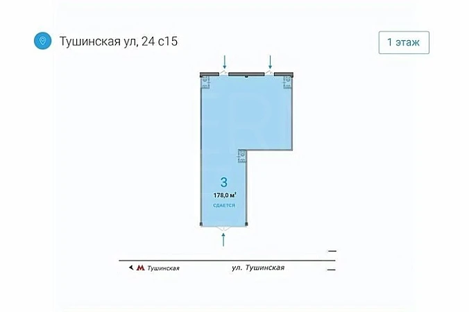 Аренда торговой площади 178 м2 м. Тушинская в САООписание: Отлично подойдет в аренду под различные виды деятельности: торговлю, магазин, аптеку, салон красоты, офис продаж, медицинский центр, кофейню и многое другое.Расположение: Помещение находится на первом этаже дома. Густонаселенный район с развитой инфраструктурой и сложившимся торговым окружением, генерирующими интенсивный пешеходный трафик вдоль помещения.Коммуникации: все коммуникации центральные.Парковка: наземная.Дополнительно: Свободная планировка. Витрина. Отдельный вход с первой линии. Отличные рекламные возможности.Месячная арендная плата (МАП) - 1 100 000 рублей.Звоните, ответим на Ваши вопросы и организуем показ в удобное для вас время! Объект №3100-960494.