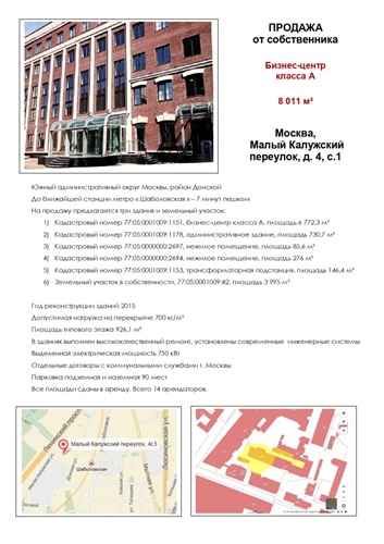 Продажа бизнес-центра 8011 м2 м. Шаболовская в ЮАО Описание: Предлагается комплекс зданий и земельный участок в собственности на продажу:1) Бизнес-центр класса А, площадь 6 772,3 м22) Административное здание, площадь 730,7 м23) Нежилое помещение, площадь 85,6 м24) Нежилое помещение, площадь 276 м25) Трансформаторная подстанция, площадь 146,4 м26) Земельный участок в собственности, площадь 3 995 м2 Бизнес-центр полностью заполнен арендаторами.Все центральные городские коммуникации.Год реконструкции зданий 2015