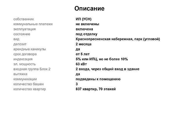 Копия Аренда ПСН 356,6 м2 м. Деловой центр в ЦАО Описание: Сдается торговое помещение на первой линии МФК Премиум - класса!Потолки переменной высоты от 4 до 6 м! Витринные окна! Площадь 356,6 м2! Подойдет под семейный ресторан или шоу-рум, салон красоты. Отдельная лифтовая группа для разгрузки/загрузки.Комплекс состоит из 3 Башен, включающие 837 квартир, 2 офисных центра для 2 компаний.Инфраструктура комплекса: Охраняемый двор с системой безопасности, детский центр, консьерж-сервис, фитнес-центр и SPA. Согласовывается летняя веранда для ресторана площадью 220 м2 с видом на Парк и Набережную Москва - река. Объект №3100-970292.
