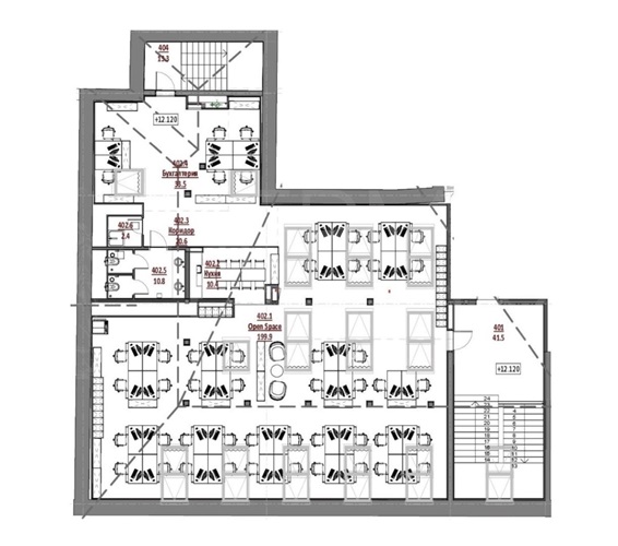 ✔ Площадь/Этажность: Офисное помещение 413.2 м² на 4-м (мансардном) этаже.