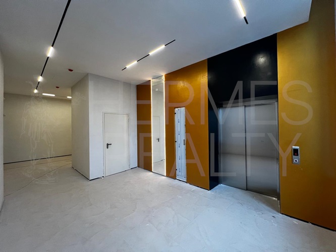 Современное здание с отделкой и высокими потолками.