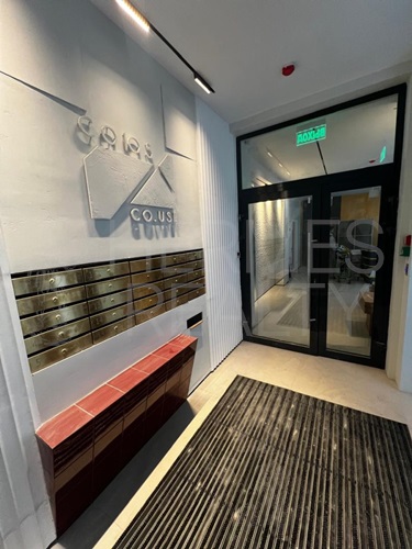 Современное здание с отделкой и высокими потолками.