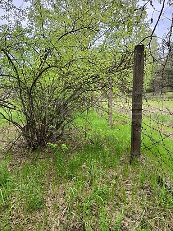 Ограждение: металлические ворота + бетонные столбы с колючей проволокой