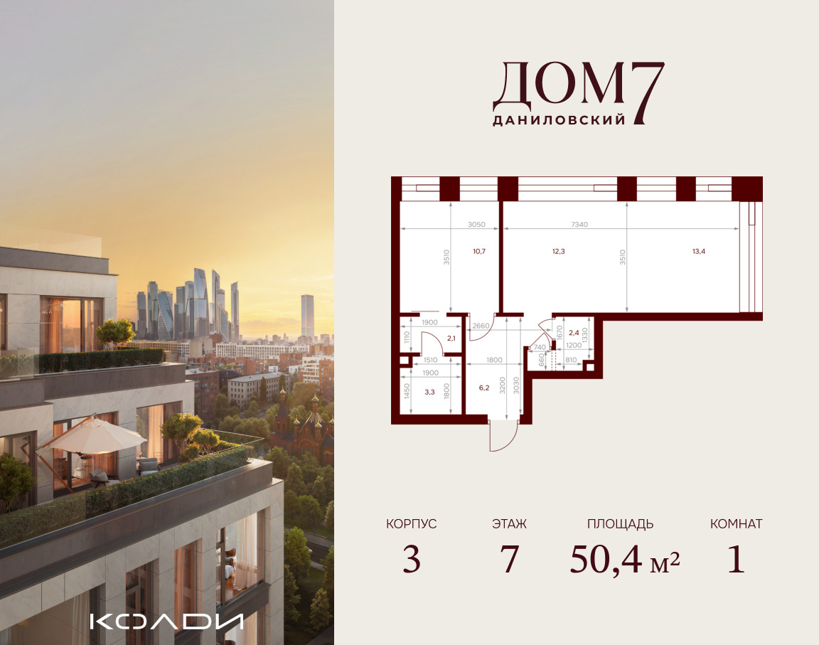 Продается 1-к квартира общей площадью 50.40 кв.м на 7 этаже в жилом квартале премиум-класса "Дом 7 Даниловский".