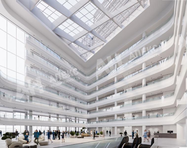 Широкие возможности для организации офисных помещений, коворкингов и переговорных комнат: высота потолков от 4,1 до 4,3 м, шаг колонн 8,4×8,4 м, панорамное остекление в пол, отделка — shell& core, энерговооруженность — 100 Вт/м², 3 отдельных лифтовых группы: 8 грузопассажирских лифтов и 2 подъемника, ожидания лифта — не более 30 сек.