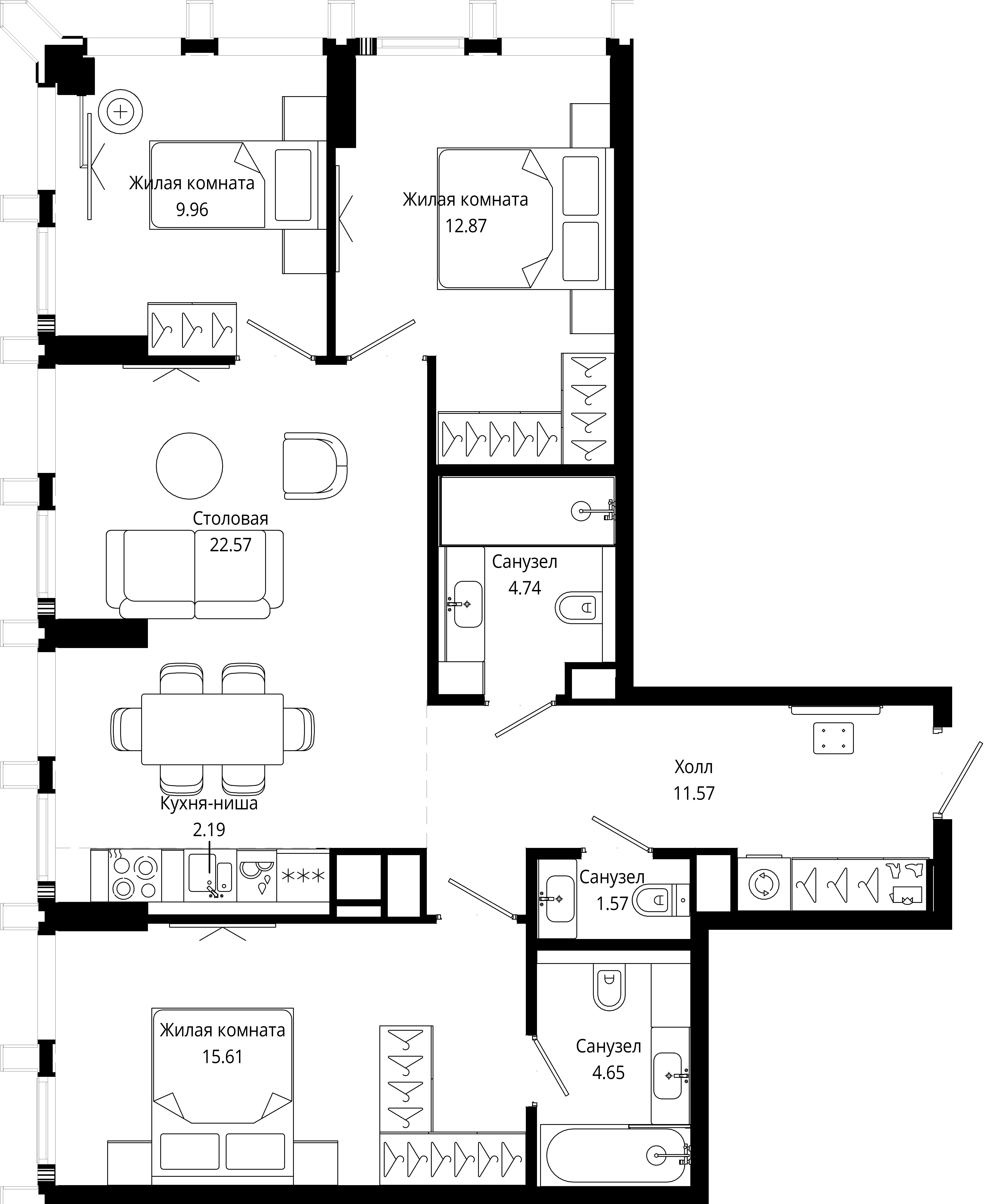 Дизайнерский ремонт выполнен с учётом всех современных тенденций и требований к комфорту. Изолированные комнаты обеспечивают уединение и возможность организации личного пространства для каждого члена семьи. Два совмещённых санузла удобны для повседневной жизни.