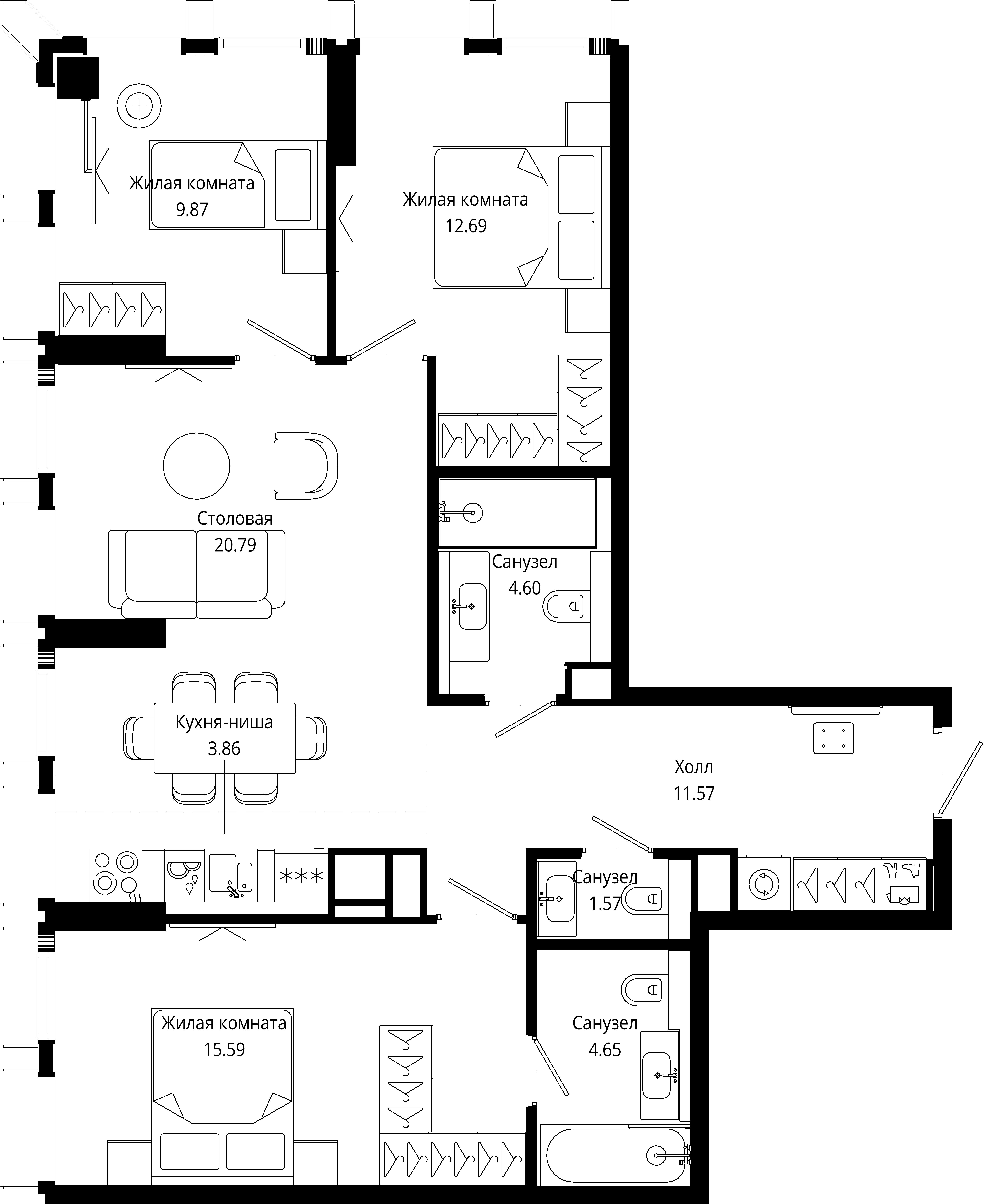 Квартира расположена на 14 этаже 43-этажного дома 2007 года постройки. Общая площадь — 123,7 кв. м, из которых 86 кв. м приходится на жилую площадь. Высота потолков 2,8 м создаёт ощущение простора и свободы.
