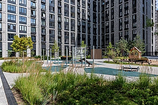 На внутренней территории квартала появится всесезонный сад площадью 1 га, разработанный архитектурной дизайн-студией GAFA, где каждый найдет то, что ему по душе: места для занятий спортом и настольным теннисом, детские площадки, уединенные уголки для медитации и спокойного отдыха.