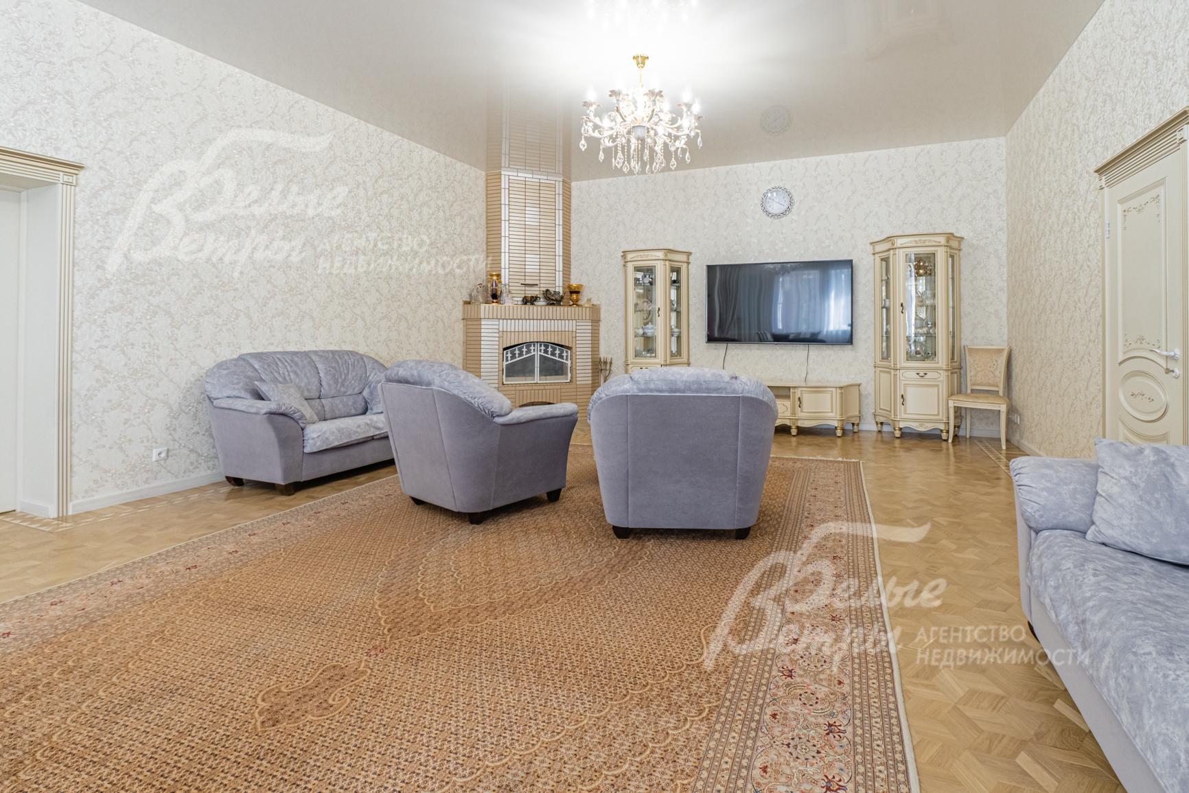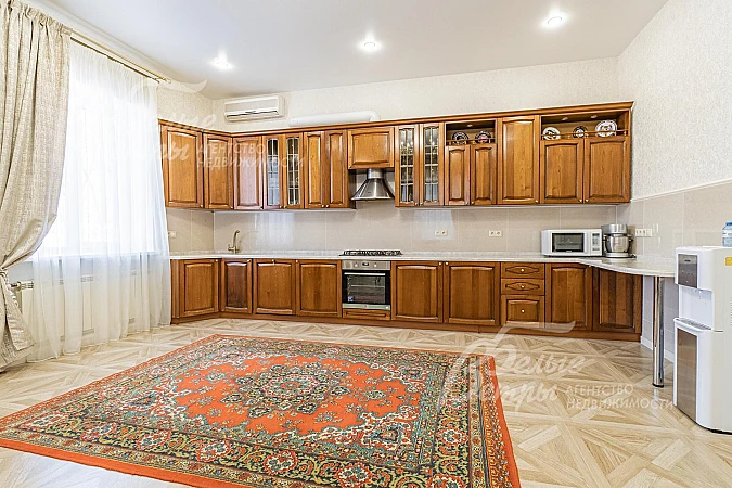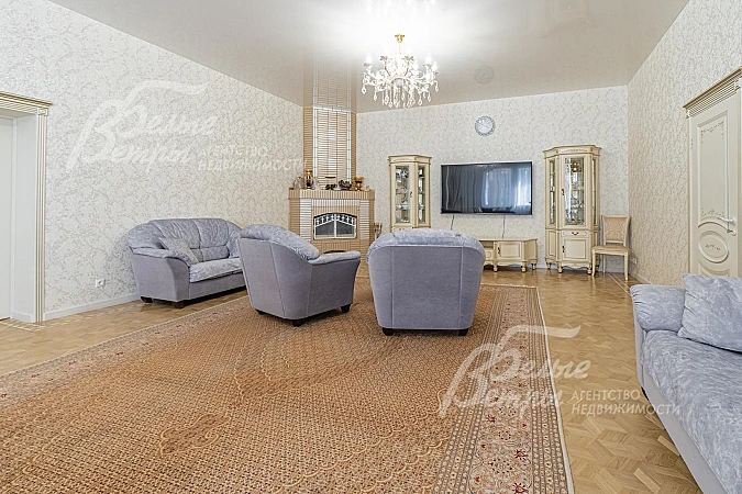 Внутренняя отделка: стены оклеены итальянскими обоями; потолки натяжные, в некоторых помещениях с подсветкой. На полу в основном доме дубовый паркет, плитка в санузлах. Лестница ж/б стандартной ширины, ступени отделаны дубовым паркетом. Установлена новая сантехника. Все коммуникации разведены под ключ. Межкомнатные двери из массива лиственницы, новые, филенчатые..
