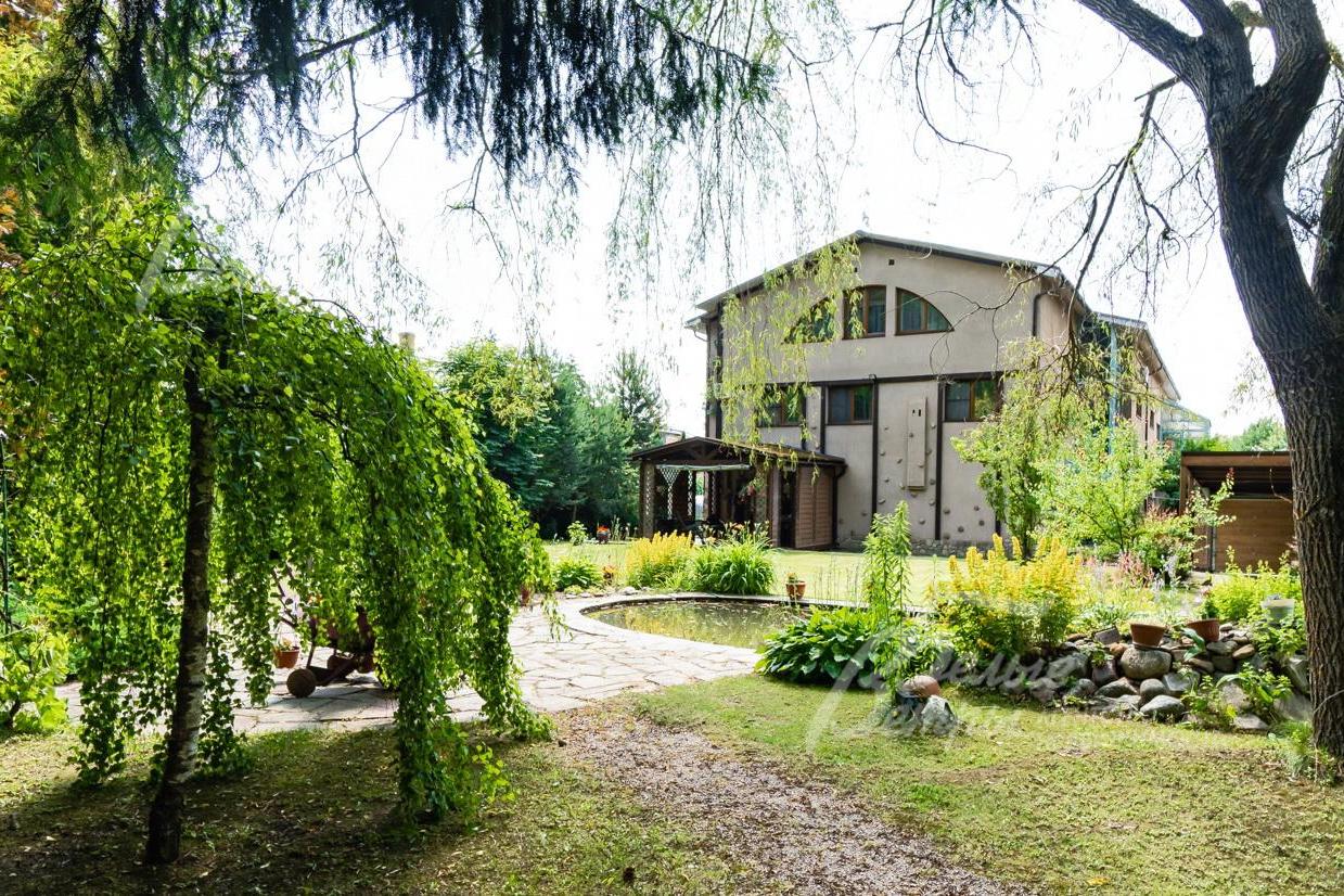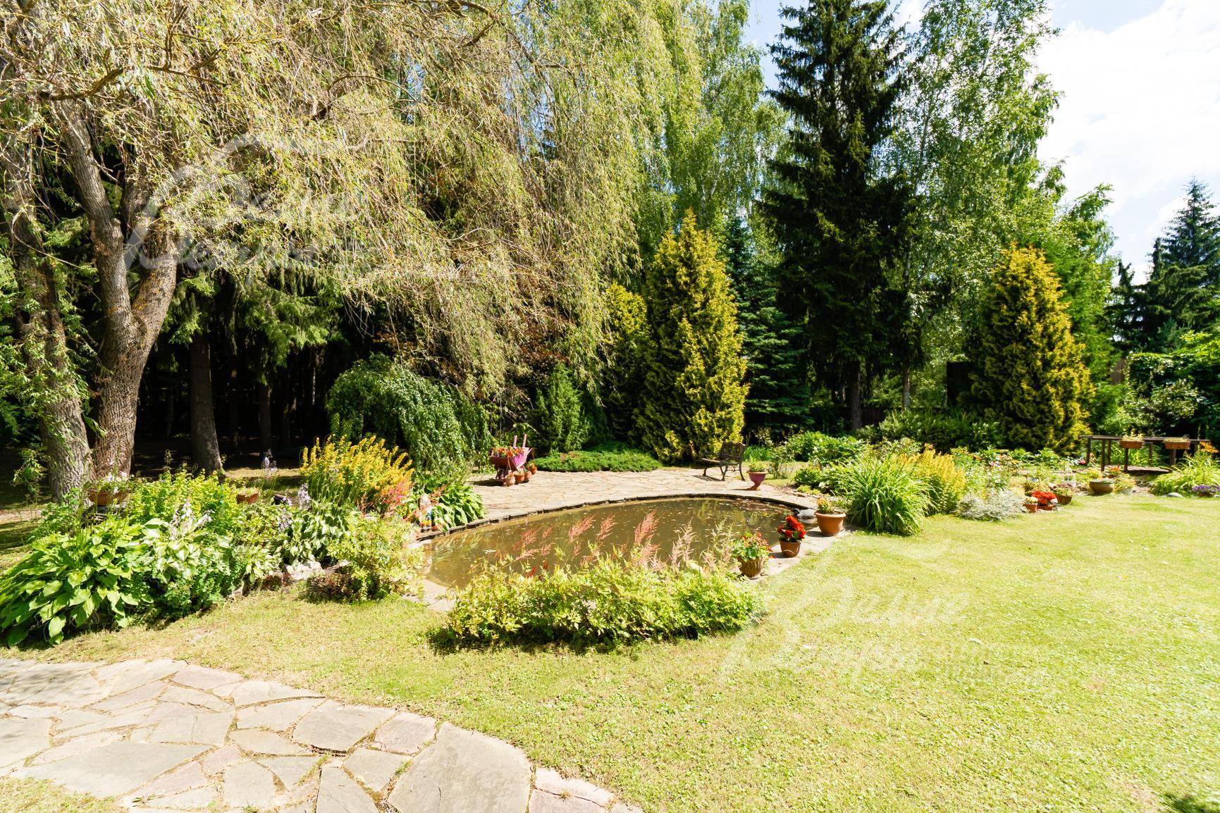 Благоустройство участка: на участке искусственный пруд с водопадом, сухой ручей, установлено ночное освещение, выложены дорожки, есть декоративные посадки, высажен газон; многообразие уникальных лесных и декоративных деревьев и кустарников (вековые ели, березы, клены, молодые сосны, голубая ель, туи и другие). \nСтатус земли: земли населенных пунктов (есть прописка).