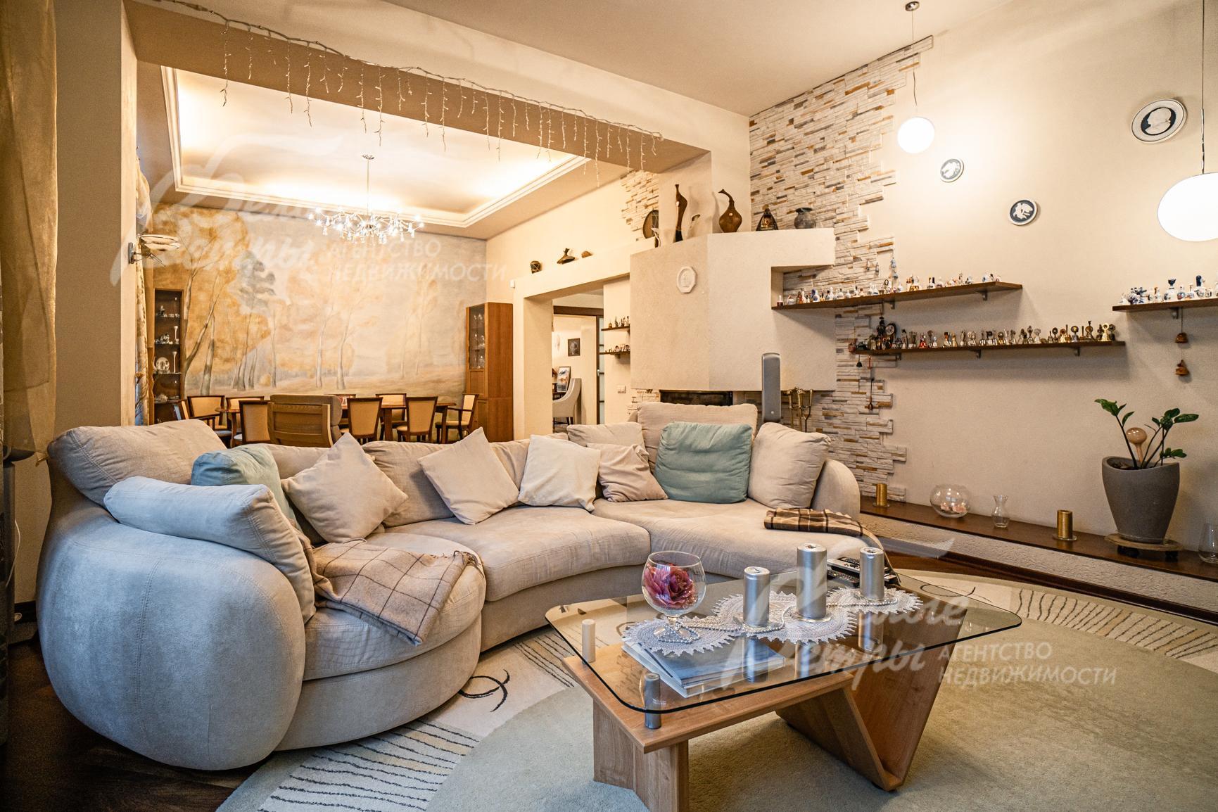 на стенах обои и декоративная штукатурка (в кабинете английские обои). На полу плитка с водяным подогревом, керамогранит, паркетная доска, в спальнях - ковролин; в доме два лестничных марша: широкий парадный - на бетонном основании, ступени из дуба; второй также на бетонном основании, отделка плиткой; сантехника установлена ведущих брендов; установлены радиаторы Kermi.