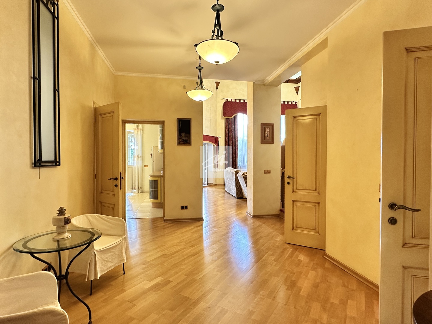 В доме выполнен дорогой, дизайнерский ремонт, с применением высококачественных материалов. Продуманная планировка. Пять изолированных спален, кабинет, лоджия, два санузла, сауна, подвальный гараж, два входа в дом.
