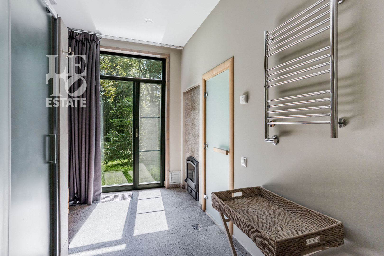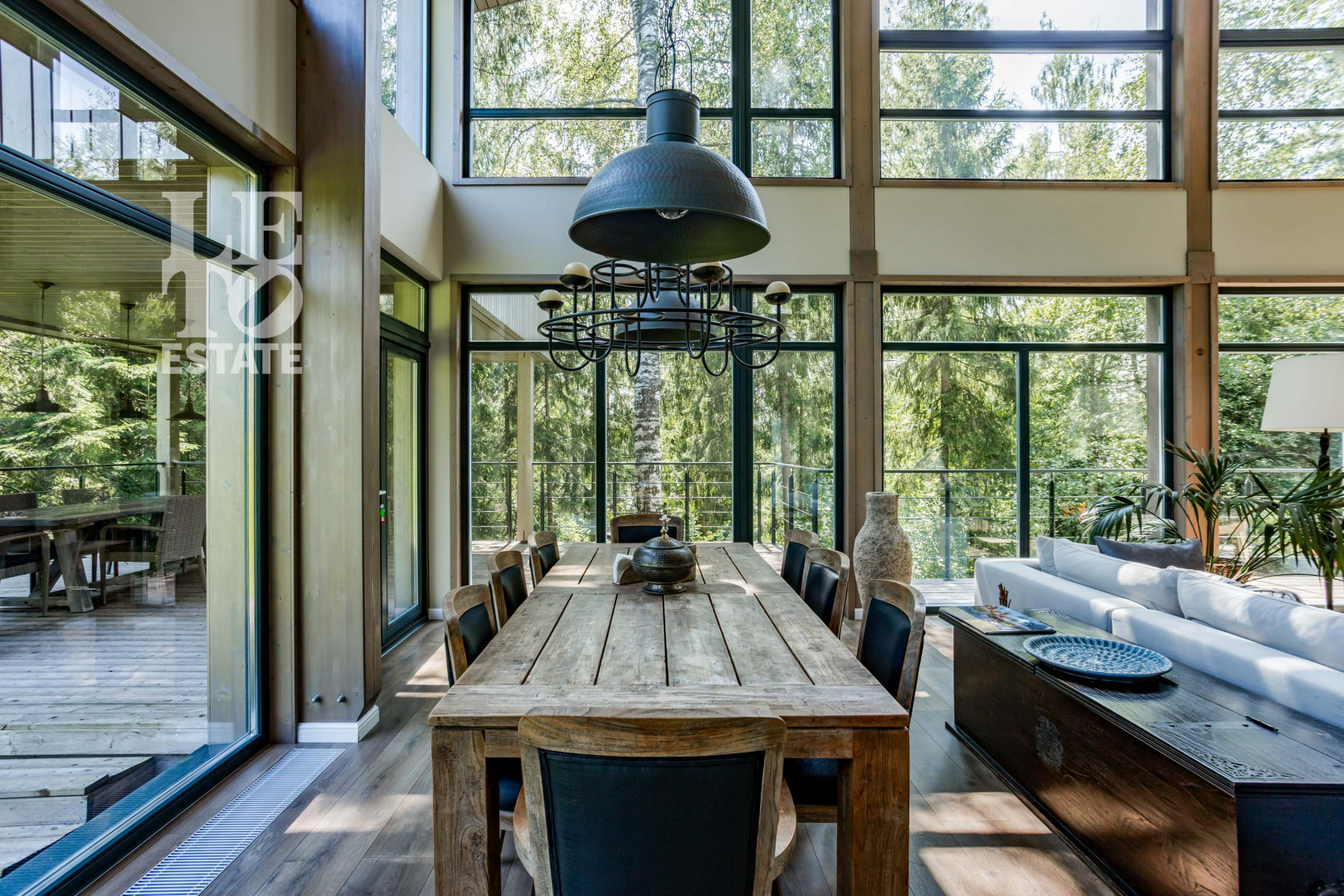 Просторный ухоженный лесной участок обеспечивает полное единение с природой и отсутствие соседей. На участке есть дом для персонала и спортивная площадка.