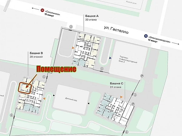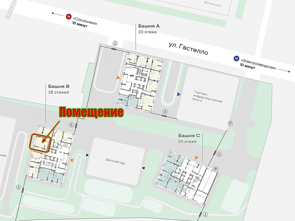 Продажа помещения свободного назначения в новом ЖК бизнес-класса SOKOLNIKI, по адресу: ВАО, Москва, ул. Гастелло, 30, площадью 51,9 кв.м. В пешей доступности находятся две станции метро — «Сокольники» и «Электрозаводская». Удобный выезд на ТТК, шоссе Энтузиастов и Садовое кольцо.