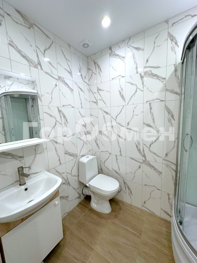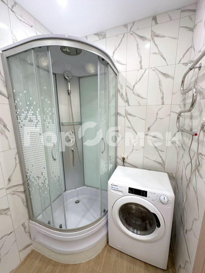 Студия полностью обустроена для комфортного проживания. Стоит двуспальная кровать с удобным матрасом, есть рабочая зона. На кухонной зоне: современный кухонный гарнитур под единой столешницей, электрическая варочная панель, полноценный двухкамерный холодильник, микроволновая печь и посудомоечная машина. Есть зона хранения в прихожей. Санузел совмещен, в плитке до потолка, стоит стиральная машина.