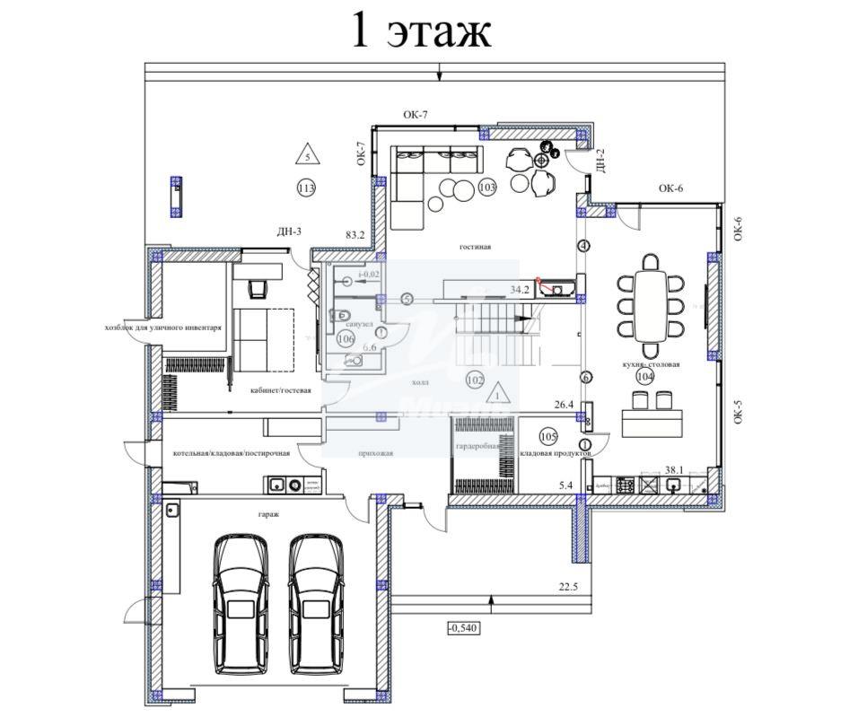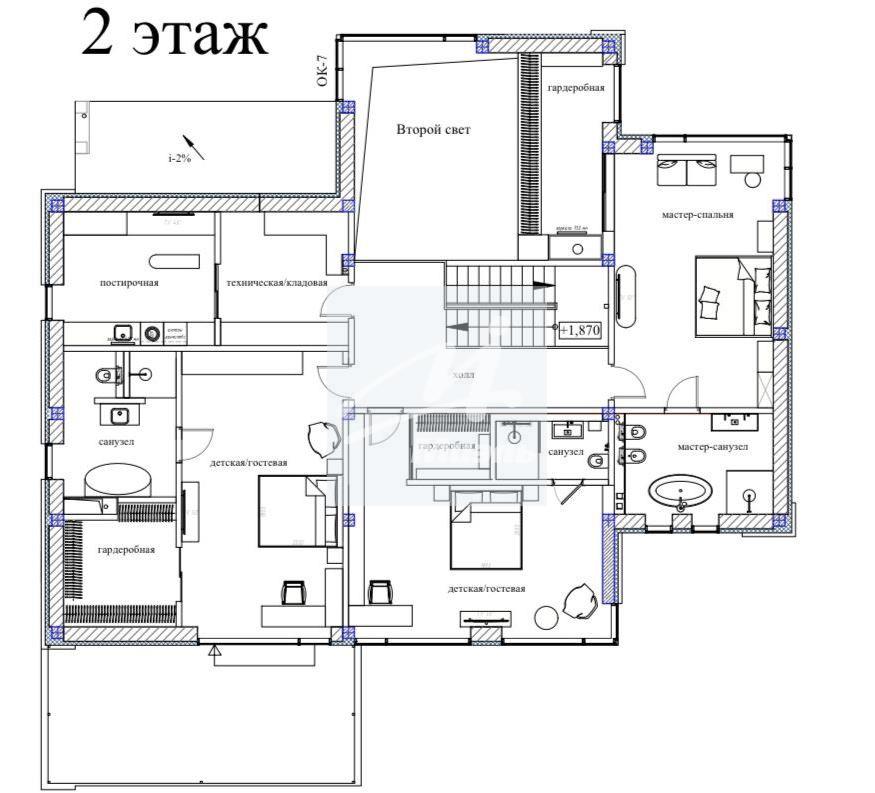 Планировка дома:на 1 этаже: прихожая, гардеробная, кухня-гостиная с камином представляет собой единое пространство, со вторым светом, с выходом на террасу и с кладовой; гостевая спальня или кабинет; с/у; бойлерная/кладовая/постирочная; отапливаемый гараж на 2 а/м;на 2 этаже: холл, мастер-спальня со своим санузлом и гардеробной; две спальни с санузлами и гардеробными; кладовая; постирочная; огромная терраса.