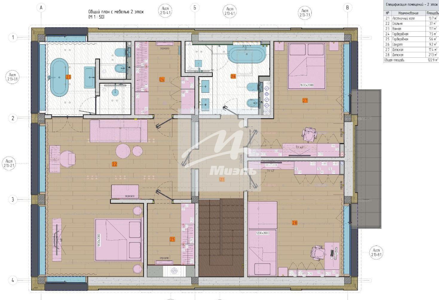 Планировка дома:на 1 этаже: прихожая, гардеробная, кухня-гостиная с дровяным камином 82 кв.м представляет собой единое пространство, с выходом на террасу; гостевая спальня или кабинет; с/у; бойлерная;на 2 этаже: холл, мастер-спальня 37 кв.м со своим санузлом и двумя гардеробными; две спальни; с/у.