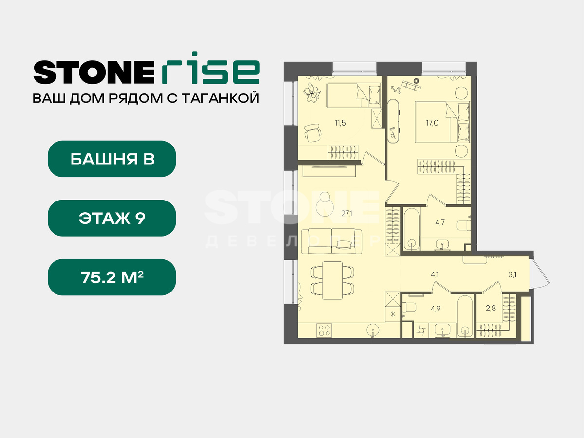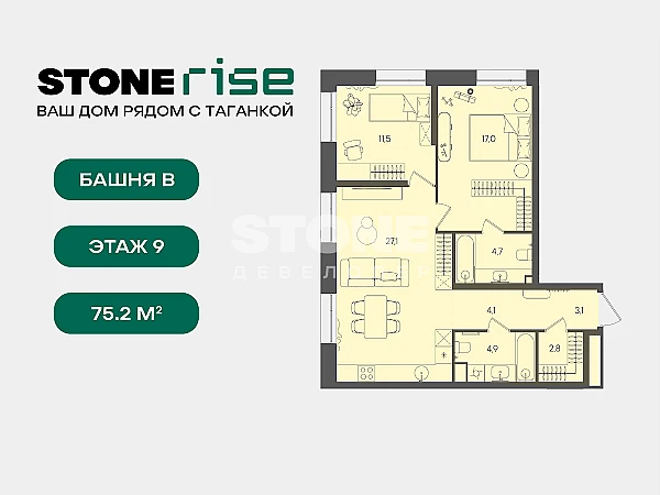 Купить 2к квартиру 75 м² в ЖК STONE Rise
