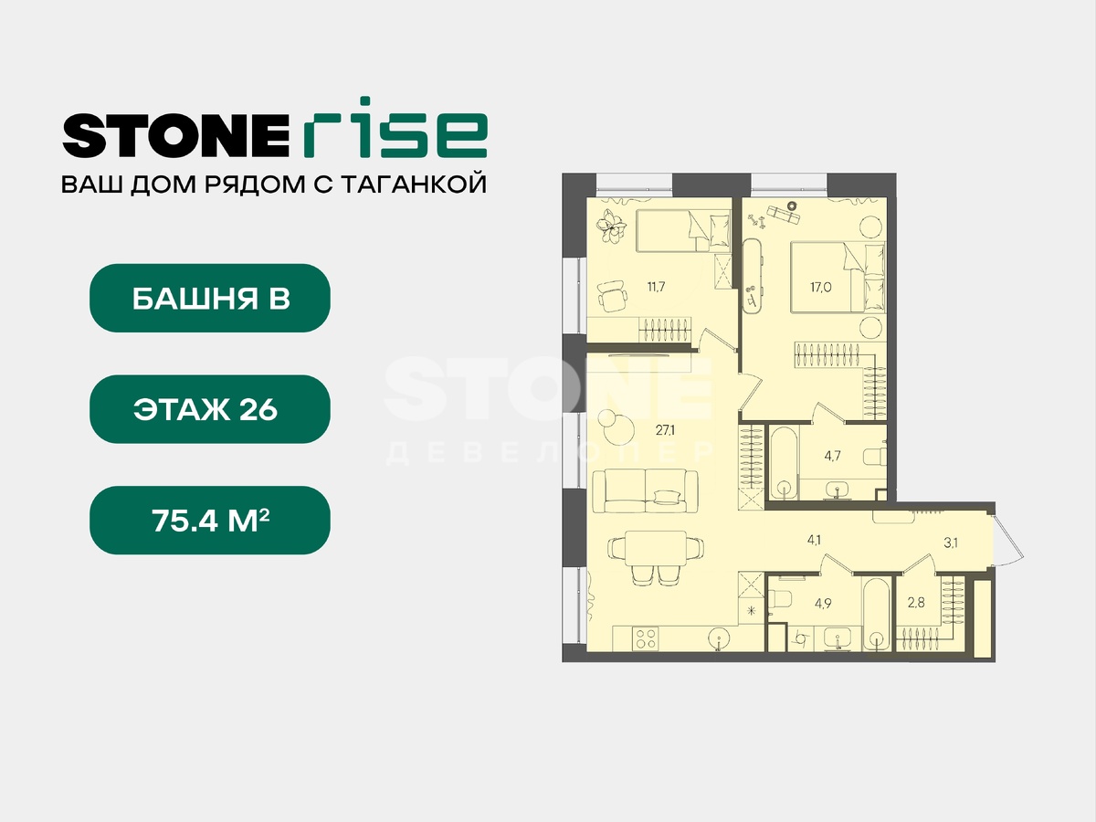 Купить 2к квартиру 75 м² в ЖК STONE Rise