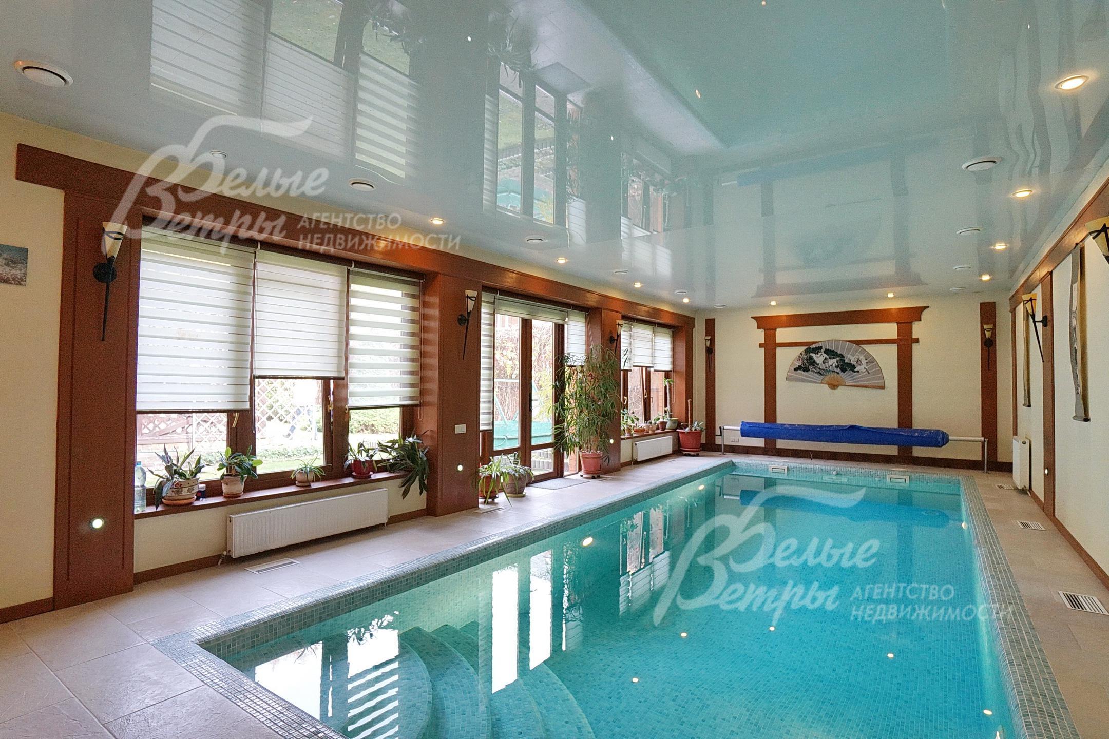 1 этаж: кухня – гостиная, спальня, баня, бассейн – 12 метров, 3 санузла, тёплый гараж на 2 м/м.