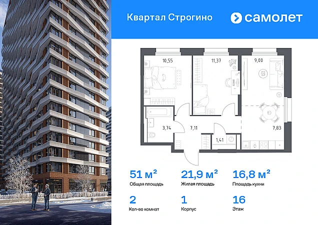 Строим кварталы для жизни с заботой о будущем. Предлагается 2-комнатная квартира комфорт-класса 51,01 кв.м в корпусе 1 на 16 этаже, в ЖК «Квартал Строгино»