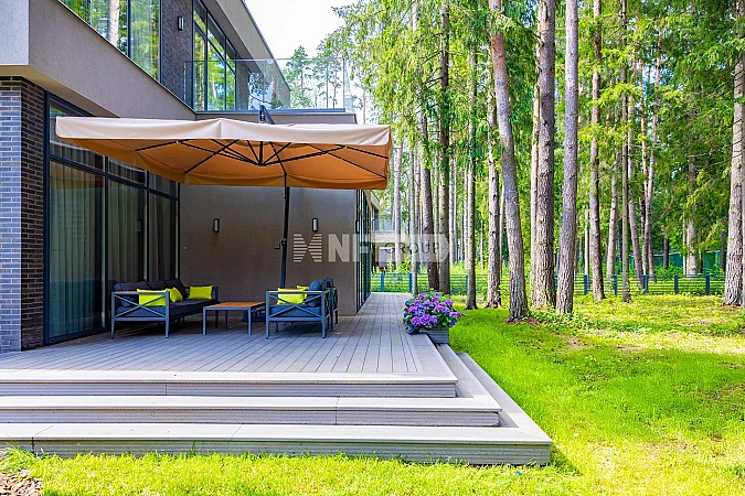 Функционально удобная планировка предусматривает комфортное проживание для семьи, а панорамное остекление с подъёмно-раздвижными системами ALUMARK и энергосберегающими стеклопакетами добавляет пространству естественного света и открывает живописный вид на пейзаж за окном — на участке в 17,85 соток прорастают вековые сосны.