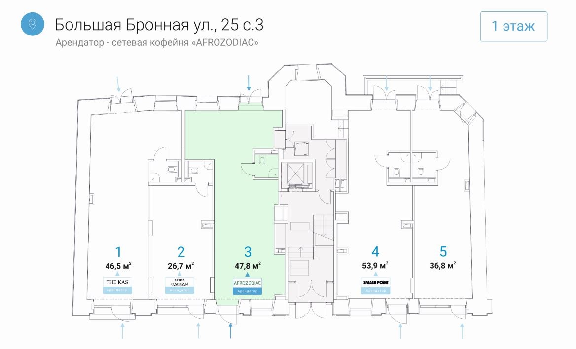 Номер лота на нашем сайте: 44166. Предлагается на продажу помещение на улице Большая Бронная, ЦАО, г. Москва, в районе знаменитых Патриарших. Продажа помещения у метро. Объект расположен на первом этаже нежилого дома, в непосредственной близости от станции метро "Пушкинская" - 1-2 минуты пешком, а также в 2-3 минутах от станций "Тверская" и "Чеховская". Сверхинтенсивный пешеходный трафик. Развитая инфраструктура, крупный жилой и деловой район. Собственная парковка перед фасадом дома. AFROZODIAС сетевая кофейня , сочетающая в себе уникальную атмосферу, технологичность, современность и высококачественный африканский кофе. Арендная плата 1 170 000 рублей в месяц, коммунальные платежи и электричество оплачиваются арендатором отдельно. Схема сделки: договор купли-продажи недвижимости (ДКПН).